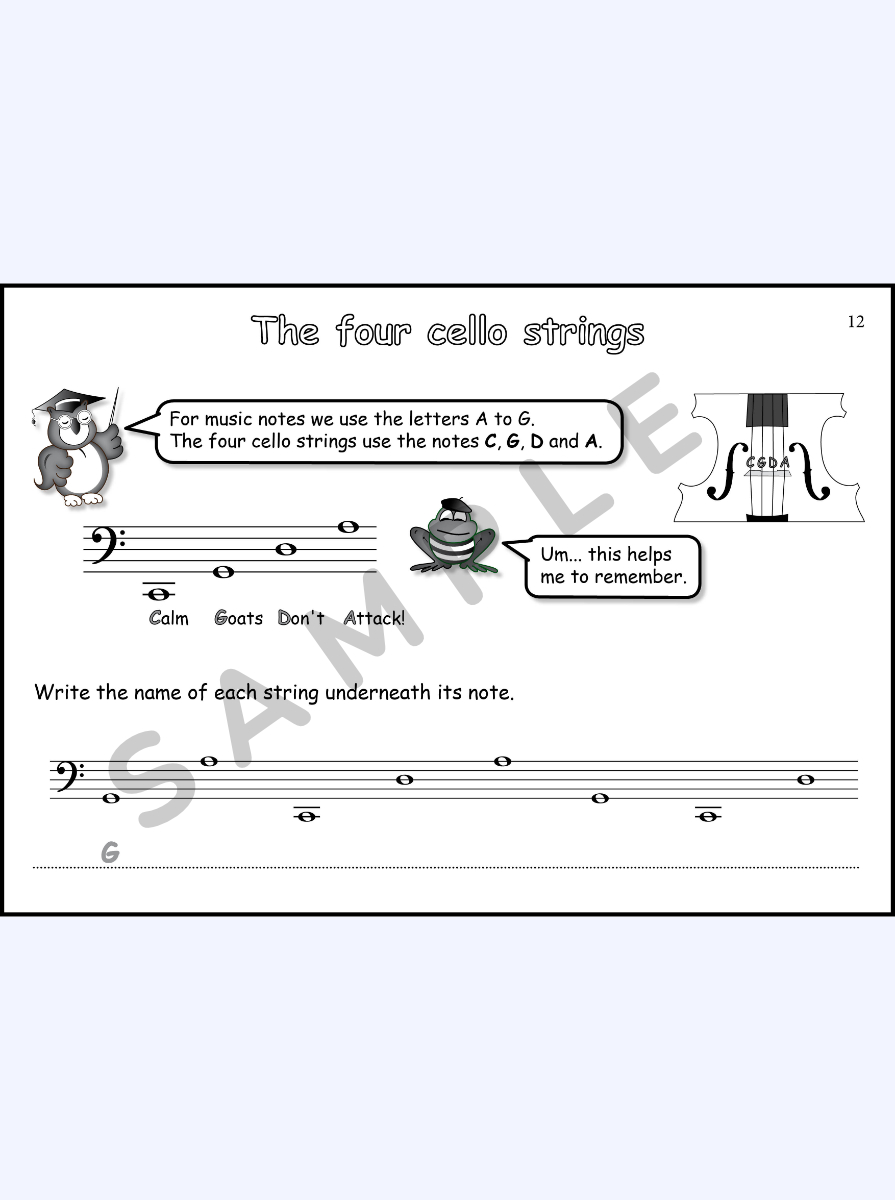 The book begins with the stave and bass clef – exactly where cello students need to start – and introduces notes that reflect the instrument’s open strings rather than defaulting to piano-based middle C. By aligning theory with what students are physically playing in their early lessons, new concepts feel logical, relevant and immediately useful.