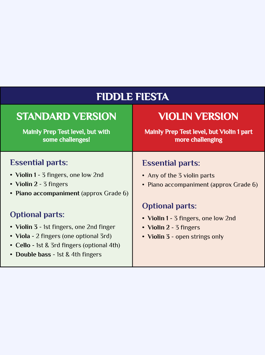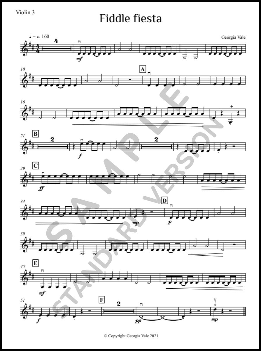 Adapted from Hey Presto! for Violin, Book 2 (Silver), this lively and energetic romp is driven by syncopated rhythms throughout, supported by an independent rhythmic double bass line. A contrasting middle section introduces playful call-and-response writing, while left-hand pizzicato and harmonics add extra colour and interest. Tremendous fun to play and excellent for developing ensemble skills — and best of all, it sounds more challenging than it really is.